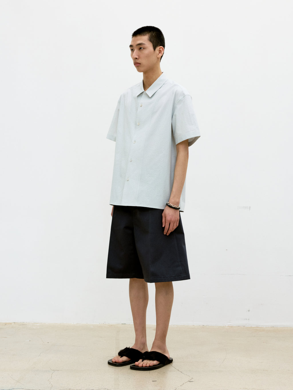 En moderne fortolkning af de klassiske bermuda-arbejdsbukser – med et wide fit silhuet der sidder afslappet og giver masser af bevægelsesfrihed. Det rene bomuldsstof giver et clean look, mens de subtile kontrast-multistitches tilføjer et gennemført detalje der løfter udtrykket. Natural nut-knapperne gør hver enkelt par unikt – det er en del af charmen. Modellen er 182 cm høj, vejer 55 kg og bærer størrelse L.