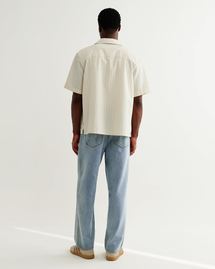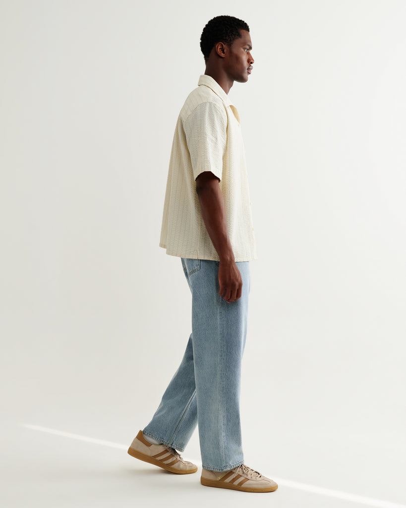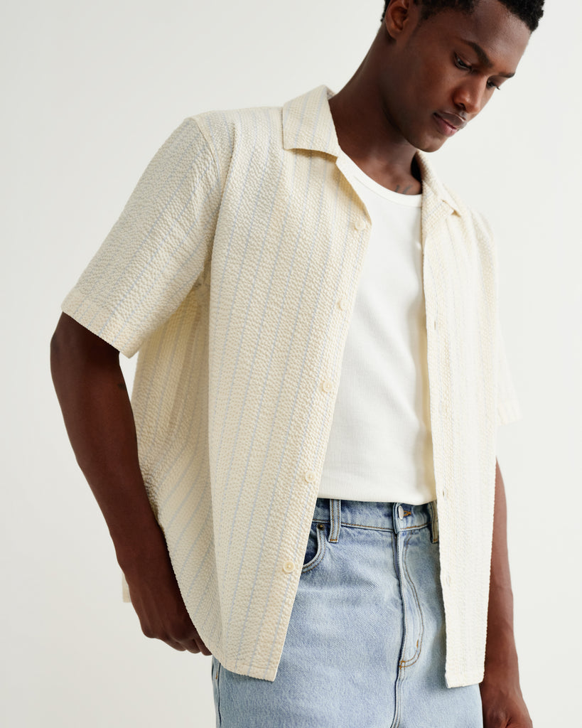 Når sommeren banker på, skal skjorten bare sidde rigtigt – og her hos Hooha værdsætter vi klassiske materialer med et moderne twist. Wax London's kortærmede Didcot skjorte i 100% bomulds seersucker er noget så lækkert med sin ecru base og dobbelte blå pinstripes. Seersucker er det ultimative sommerstof med sin karakteristiske krusede overflade, der holder stoffet væk fra huden og sørger for god luftcirkulation, så du holder dig kølig på varme dage. Den afslappede pasform med slids i siderne giver dig frihed til at bevæge dig, og den preppy finish med de diskrete striber giver et tidløst udtryk, der fungerer til det meste – fra weekendens afslappede timer til sommeraftener på terrassen.