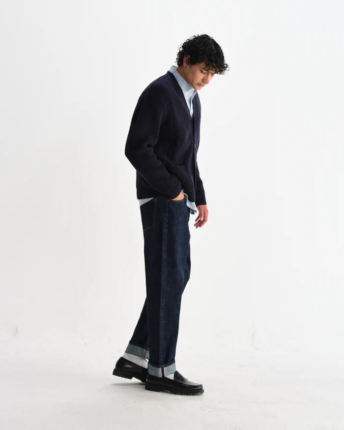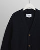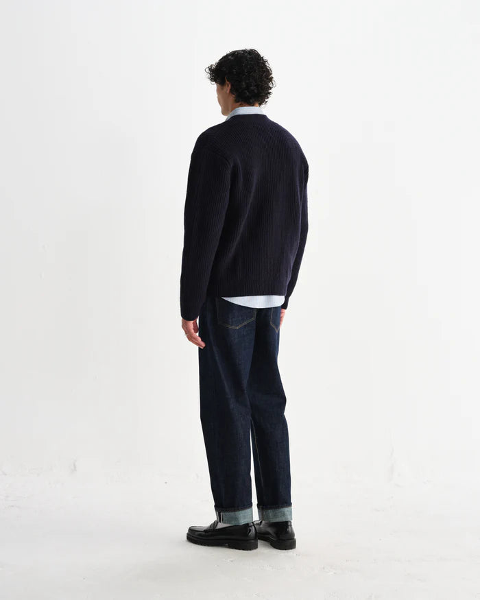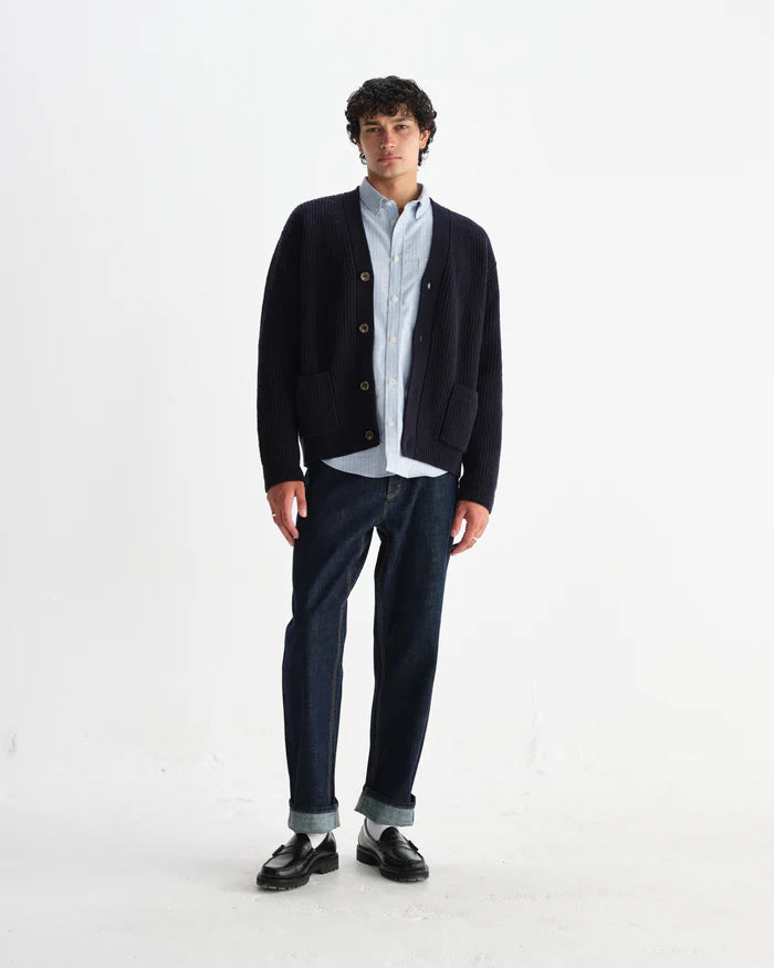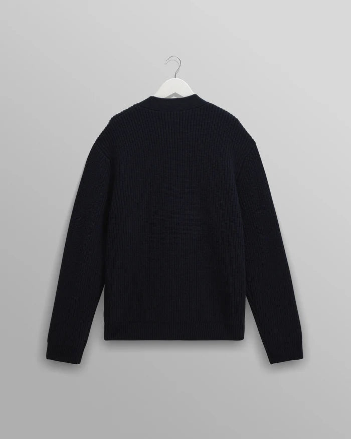 Denne Walker Cardigan i klassisk navy fra Wax London er det perfekte mix af komfort og sofistikeret stil. Den klassiske cardigan-silhuet giver et elegant, men afslappet look der fungerer til både hverdagen og mere formelle lejligheder.