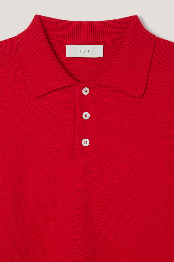 En cashmere blend collar knit i en flot rød farve, der kombinerer luksus med hverdagskomfort. Den bløde og fleksible bomuldstekstur møder kashmirets varme i en let og luksuriøs finish, der rører huden blidt uden at irritere. Med sin sofistikerede polokrave-design og logo-graveret knap udtrykker den Dunsts brand identity på en subtil måde. Den moderat løse pasform skaber en behagelig fit og et neat udtryk, mens ærmer og søm er afsluttet med elastisk ribstrik for en naturlig silhuet.