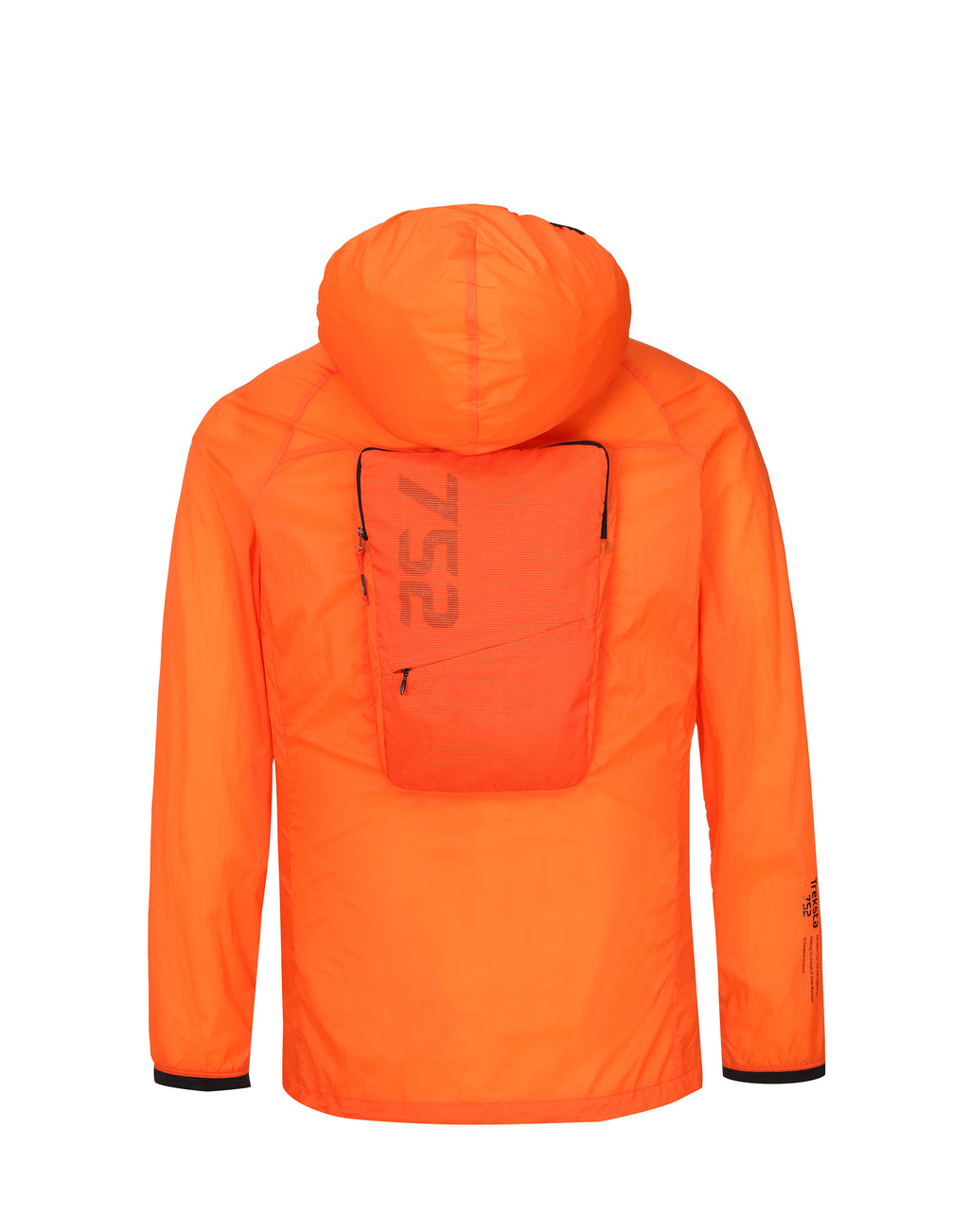 jakken er vand afvisende og kan pakkes helt ned i rummet placeret på ryggen hvis vejret skifter til det bedre.